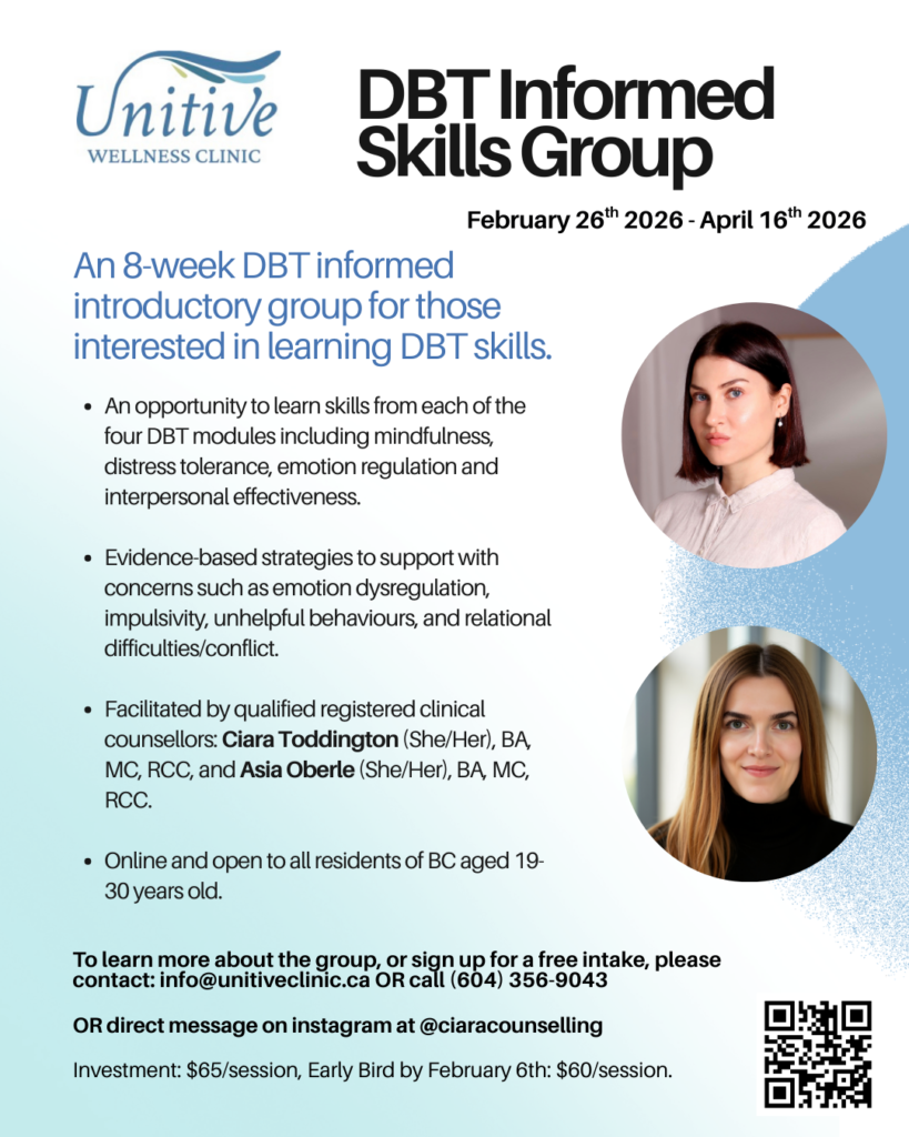 An 8 week virtual DBT informed group offered on Thursdays starting Feb 26 to Apr 16 , 6 to 7:30 Pm online.